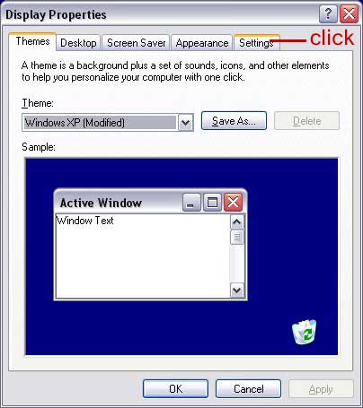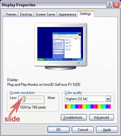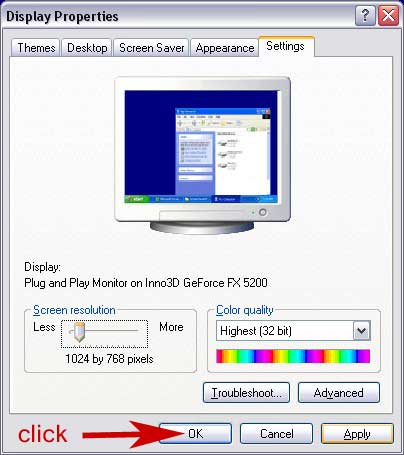 (VISTA: Instead of Properties, select Personalize) A box will pop up with 5 tabs. Select the Settings tab (far right): (VISTA: Options are not tabbed, but appear as a list - select the bottom option - marked Display Settings) This will bring up the settings window. Push the slider to the correct resolution (1024 x 768). If this option is not available, your monitor or graphics card may not provide this resolution: Finally, click the Apply button and the new resolution will come into effect: The screen should reset to the new resolution, with the last menu still active. To finish the settings, click OK: On some operating systems, you may be asked if you wish to accept the new settings or revert to the last setting. Click ACCEPT. BACK TO INSTRUCTIONS ....... TYPING PRACTICE ....... TYPING GAME |